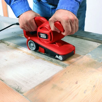 Met deze bandschuurmachine KA86-QS van BLACK+DECKER kunt u gemakkelijk en comfortabel grote oppervlakten schuren van bijvoorbeeld vloeren en lambrisering. De machine heeft een krachtige 720 watt motor en door de automatische bandcentrering hoeft u zich geen zorgen te maken dat het schuurpapier van de band af loopt. Daarbij wordt de KA86-QS geleverd met een stofzak die het stof opvangt die vrij komt bij het schuren. De snoer heeft een lengte van drie meter waarmee u door het grote bereik makkelijk een groot oppervlakte mee kan bewerken. Een ideale schuurmachine voor in huis.