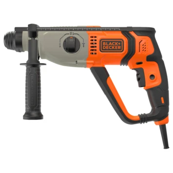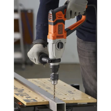 De BLACK+DECKER pneumatische boorhamer BEHS02K-QS is een krachtige machine van 800W die geschikt is voor het snel en efficiënt boren, hamerboren en beitelen in baksteen, snelbouwsteen, steen en beton. Door de SDS+ boorkop kun je snel en eenvoudig de verschillende accessoires verwisselen. De boormachine heeft 2,2 Joule slagkracht en het hamermechanisme levert tot 4600 slagen per minuut. De snelheid is variabel waardoor je een betere controle hebt en veiliger werkt. De diepte-aanslag van de boormachine zorgt voor nauwkeurig boren tot de gewenste diepte. Er wordt een adapter meegeleverd voor “gewone” boortjes, zodat je ook (als je het slagmechaniek uitschakelt) kunt boren in metaal (tot 13mm) en hout (tot 40mm). Het nieuw ontwikkelde handvat zorgt voor een zeer goede vibratiedemping. Er worden standaard 1 x 6mm en 1 x 8mm SDS+ betonboren meegeleverd. Dit alles zit verpakt in een stevige koffer.