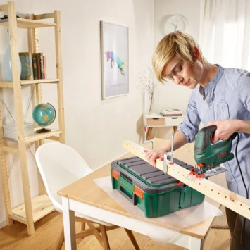 De Bosch decoupeerzaag PST 700 E is een krachtige en praktische decoupeerzaag van Bosch. Daarbij garandeert deze een uitstekende hanteerbaarheid en een gecontroleerd en optimaal comfort voor de gebruiker. Met de 500 watt-motor biedt de machine veel prestatie en comfort. De traploze regeling van het aantal zaagbewegingen via de gasgeefschakelaar maakt het mogelijk om behoedzaam te beginnen met zagen in alle materialen. Bosch PST 700 E haalt zaagdieptes tot 70 millimeter in hout evenals tien millimeter in aluminium en vier millimeter in staal. De Bosch systeembox kunt u eenvoudig gebruiken als werktafel d.m.v. de meegeleverde klemmen. De Bosch decoupeerzaag wordt geleverd in een praktische SystemBox. De SystemBox is stapelbaar en volledig flexibel in te richten en door de hendel is de box ook gemakkelijk te transporteren. In de Systembox kunnen aparte accessoire boxjes worden geplaatst waardoor deze naar wens kan worden ingericht. De systeembox is al voorzien van 3 zaagbladen, 2 klemmen, anti slipmat een potlood en een duimstok. De box is al voorzien van de eerste extra accessoires. Kortom: De Bosch decoupeerzaag PST700 SystemBox heeft alles in één gereedschapskoffer voor de gehele klus!